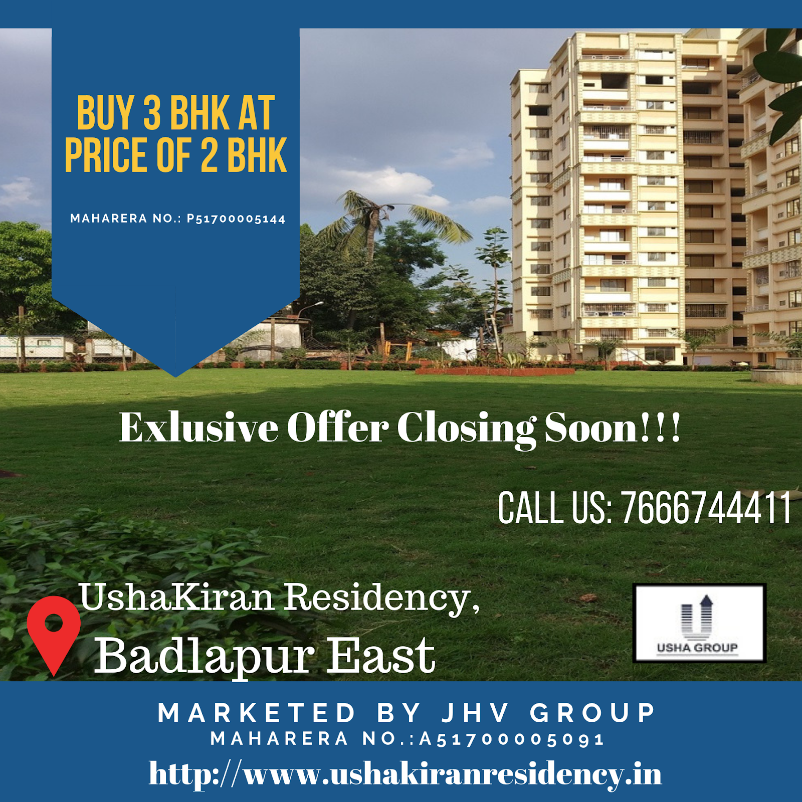 3 BHK Flats in Badlapur East Book your 3 BHK Apartment at Dream Township project by UshaKiran Residency during the monsoon offers "BUY 3 BHK at Price of 2 BHK"Premium 3 BHK flats with Modern Amenities